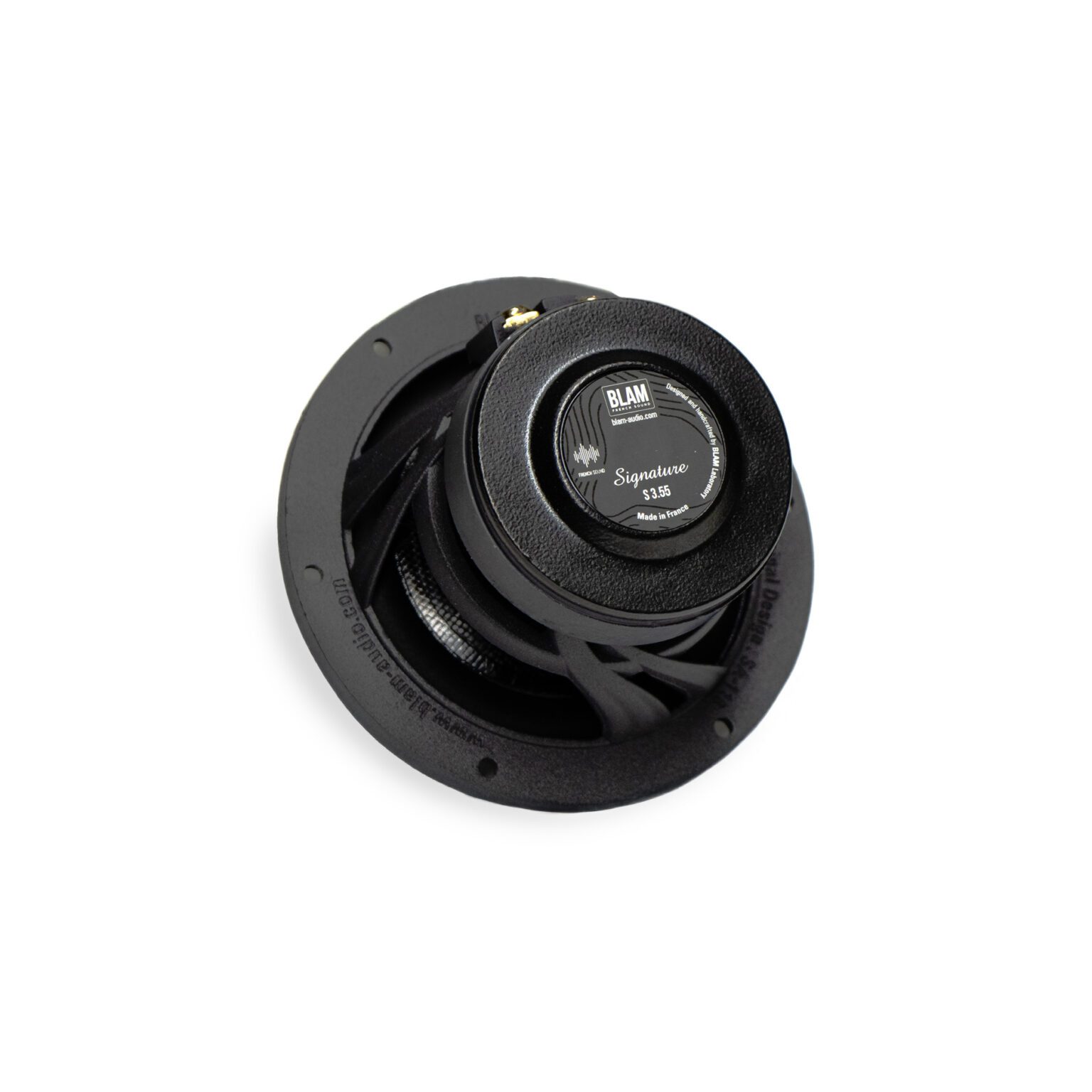 Die-cast aluminum basket – Ultra-rigid carbon fiber cone – NBR surround – Long-life “conex” spider – 20 mm voice coil, fiberglass support – Oversized 55 mm x 10 mm magnetic motor – Machined aluminum phase plug – Gold-plated terminal block. Motor – Machined aluminum phase plug – Gold-plated terminal block.